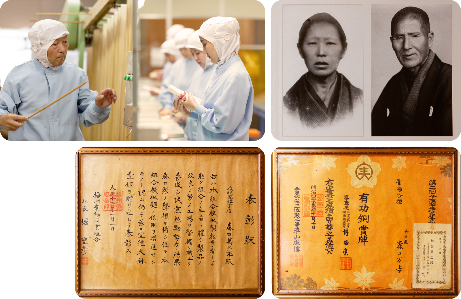 明治時代の初めに初代・森⼝万吉が農業のかたわら⼿延べそうめんづくりを開始したのが森⼝製粉製麺の始まりです。万吉はつるつるとした喉越しと弾⼒のある⾷感を持つ独⾃の麺づくりを追求。明治時代になると当時では珍しかった発動機を導⼊し、⽇夜、改良と⼯夫を凝らし、品質と⽣産量が安定する機械麺づくりに成功しました。昭和23年に森⼝製粉製麺株式会社を設⽴し、それからは⼿延べそうめんに留まらず、バラエティ豊かなオリジナル商品を開発。現在は、そうめん、カレー麺、ひやむぎ、そば、うどん、中華麺、パスタなどさまざまな乾麺をつくっています。